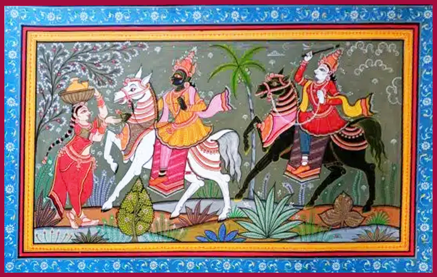 It so happened that when the soldiers, headed by the king Purusottam Dev, reached a place near the Chilika lake, a lady ,who was selling curd ( a milk preparation, sour in taste ) met him ( the king ) and presented a golden ring studded with precious gems and submitted . " Mahaprabhu, kindly listen to me. A little earlier, two soldiers riding over two horses ( white and black in colour ), approached me and said
