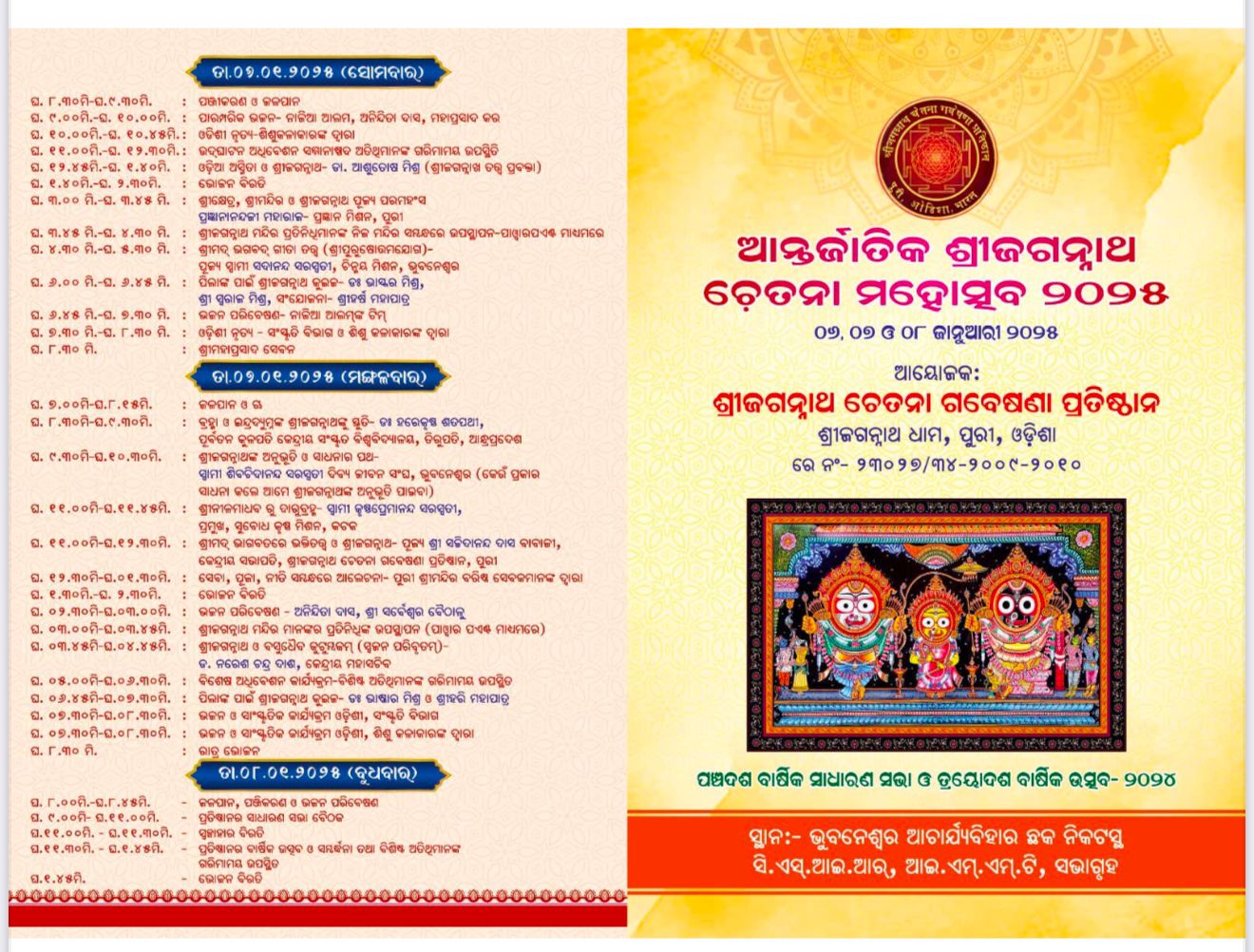 Keeping this in view, Sri Jagannath Chetana Gavesana Pratisthan, a national level organisation has been established at puri with a galaxy of leading elite persons in different fields of the society. The pratisthan will endeavour to collect,preserve and take up the original study of both historical and puranic records with a view to establish the basic character of cultural synthesis of Jagannath Chetana at this juncture of time when human society is fragmented in the basis of religion and communal consideration.
